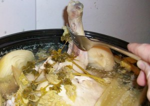 Get a whole chicken, defrosted. If it is frozen, set it in the refrigerator to thaw for 2-3 days on a large tray covered in plastic wrap. When thawed, empty each end cavity of the chicken and discard any loose or bagged parts (in my family we call them “pieces-parts”). Place the entire chicken in the crock pot.