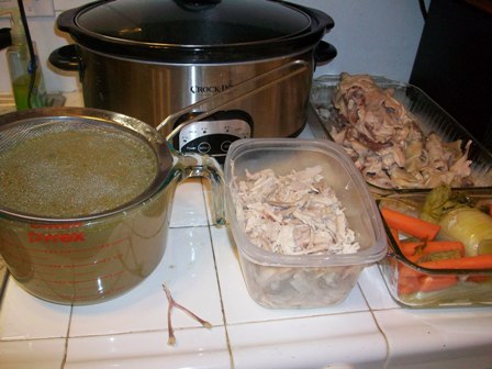 The greatest thing about this method: I get not only many nights worth of shredded chicken, but I also get about 64 ounces of homemade chicken stock (about $5 worth if I had purchased the stock), and chicken flavored carrots for the dog. My estimated savings on one chicken, including vegetable cost: $18.