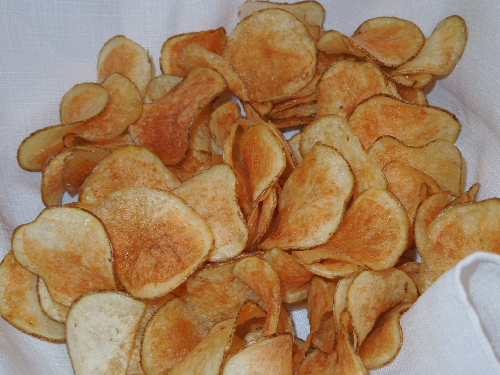 Some of the best recipes I’ve come up with were recipes created from a small budget, an abundance of one ingredient and a lack of time. This recipe is an example of that. Potatoes have to be one of the cheapest groceries you can buy. Potato chips, on the other hand, aren’t so cheap. My calculation reveals that my 10 pound bag of potatoes cost me 29 cents a pound. One potato weighs roughly a half pound. One potato worth of chips per person brings the total per person potato cost to 14 cents each. And you have a cheap snack or side dish that really dresses things up. You can even experiment with other seasonings on top! Trust me, your family and guests will be impressed.