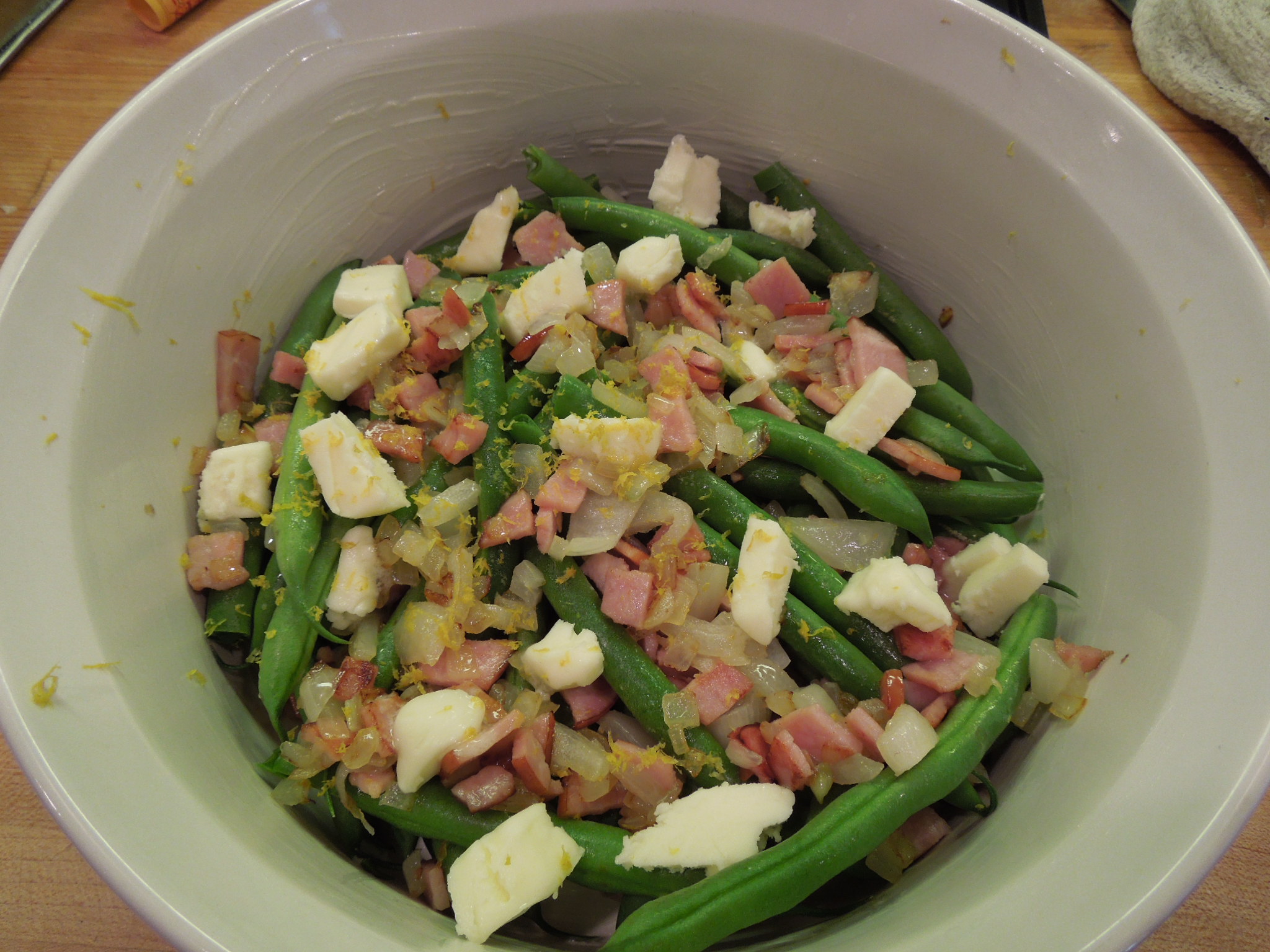 Preaheat oven to 400 degrees. In a skillet on medium heat, par cook bacon and onion together until bacon is mostly done and onions are semi-translucent. Drain off all but 2 tablespoons of grease. In a glass baking dish or casserole dish, place green beans, sprinkle with salt and peper, top with bacon/onion mixture, lemon zest and butter. Cover pan with lid or tin foil. Bake in oven 25-30 minutes or until beans are done to your likeness. Stir mixture half way through cooking.