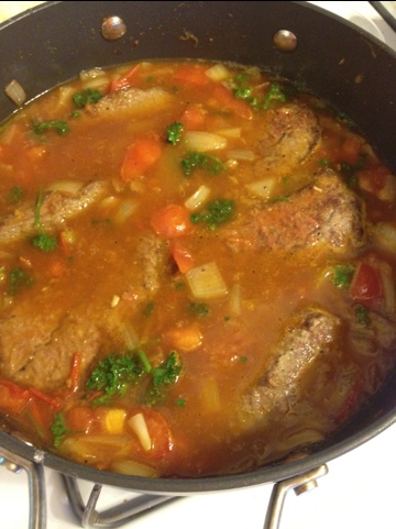 Remove steaks after browning and set aside. Place onions and garlic into the hot oil. Cook about 5 minutes, until they begin to brown, then add tomatoes. Allow tomatoes to cook 5 minutes, then stir in tomato paste (I used regular in a can, not ultra concentrated in a tube).