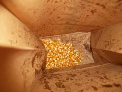 1. Place 1/4 cup popcorn kernels in a plain paper lunch bag.