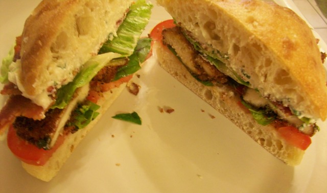 When the chicken is cooked, serve on room temperature or toasted rolls. Coat the top of each roll with a nice layer of Garlicy Cheese Goo and add hot chicken. Add tomato slices, **bacon**, whole basil leaves and lettuce for a spectacular sandwich!