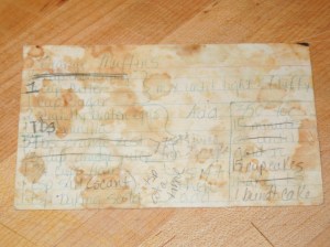 This recipe should probably be called Orange Butter Cake because it is so moist. I first made orange cake years ago for a friend’s birthday. I had asked her what her favorite cake was. She really liked some kind of orange muffin at a diner in Santa Cruz so I started researching. I never did find and perfect the muffins she likes but this recipe has been a recipe staple since then anyway. I’ve long since memorized my recipe but just for blogging sake, I offer you a photo of my care worn recipe card.