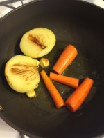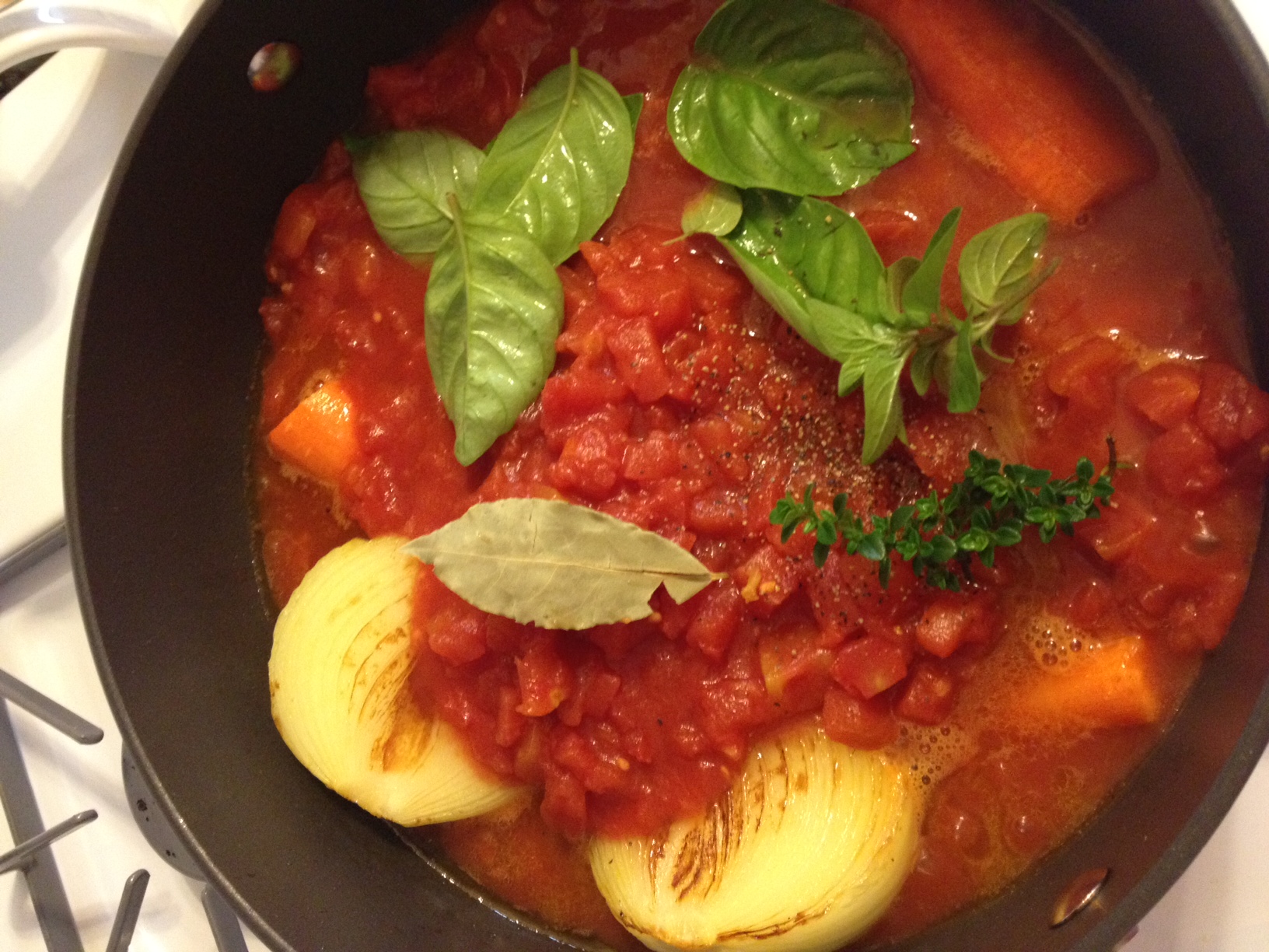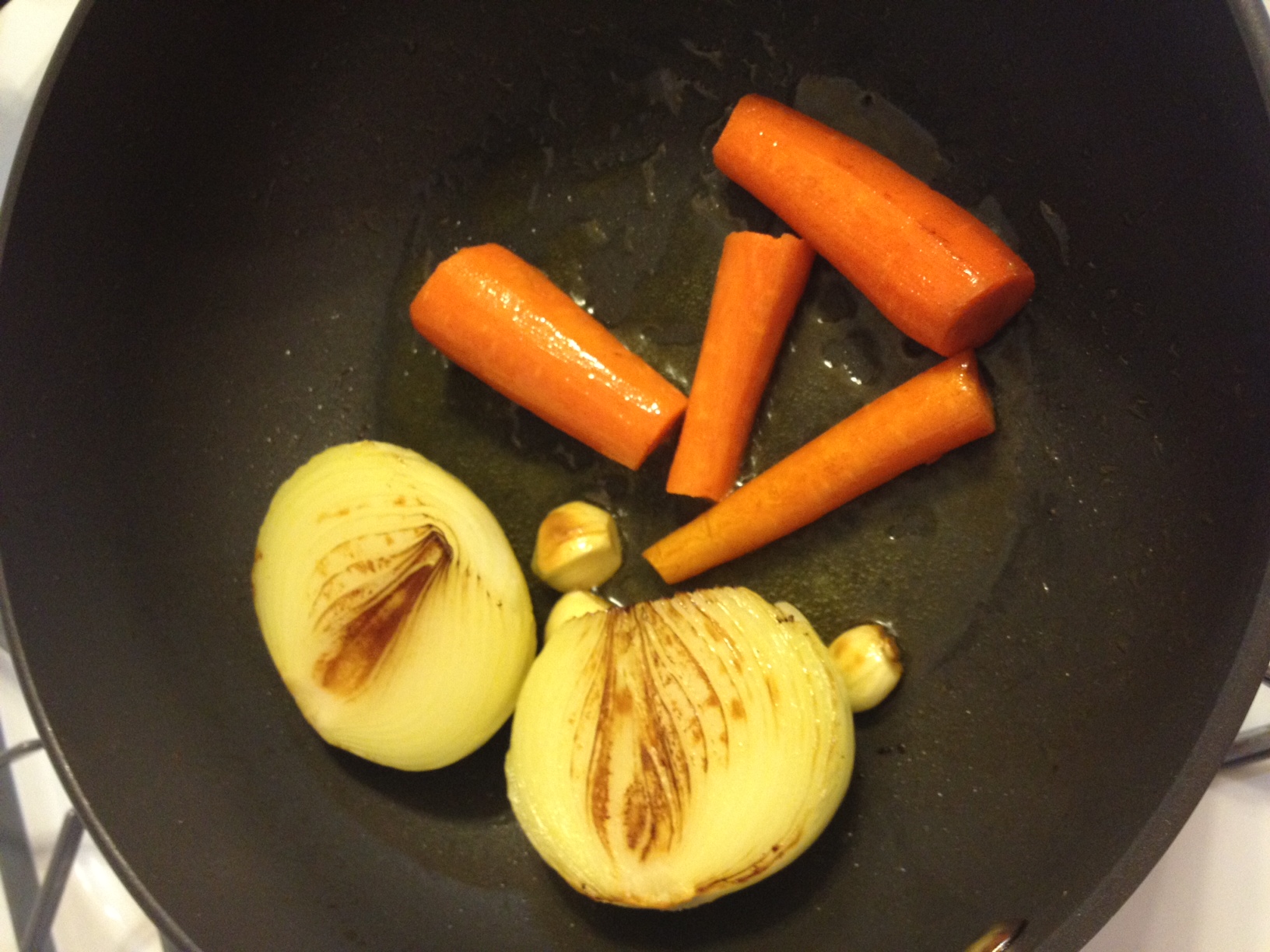 Remove the paper the outer layer from the onions and garlic. Slice the onion in half. Clean two carrots and remove the ends, cut in half. Heat olive oil over medium high heat. Place the carrots, garlic and onion (cut side down) in the hot oil. When the onion starts to form a caramel color, add in all remaining ingredients. Leave the thyme and oregano leaves on their stems. Mix well, being careful not to break apart the onion.