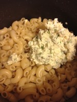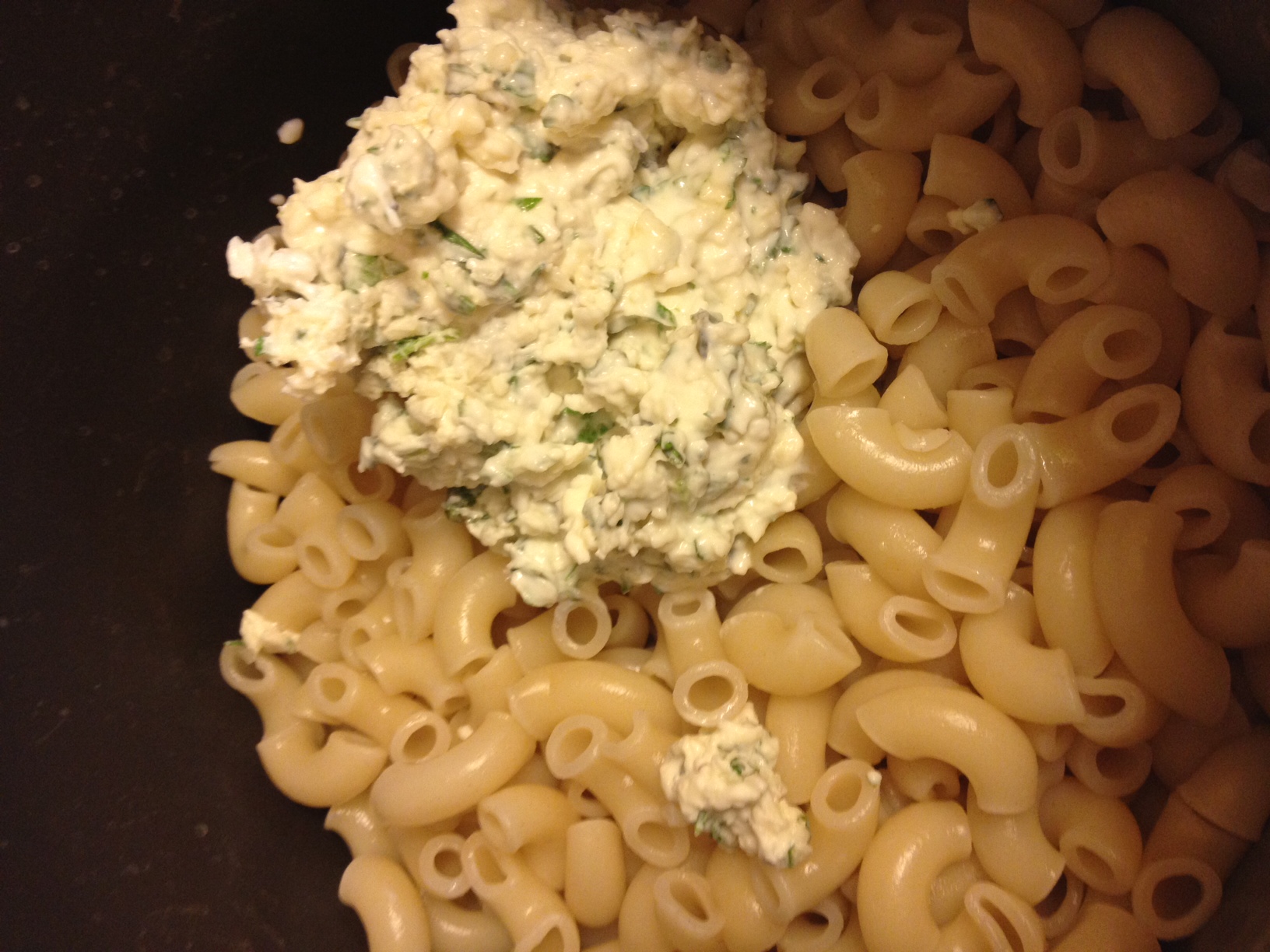 After your sauce is going, boil a pot of water for pasta – salt the water well. Mix all other ingredients except water in a small bowl. When the pasta is cooked to al dente, turn off the heat. Remove 1/2 cup of boiling pasta water, then drain the pasta (if you forget to reserve the pasta water, simply heat a 1/2 cup of water to boiling in the microwave). Return pasta to the pot, then mix in cheese/herb mixture. Slowly add in the pasta water to distribute the cheese mixture.