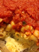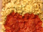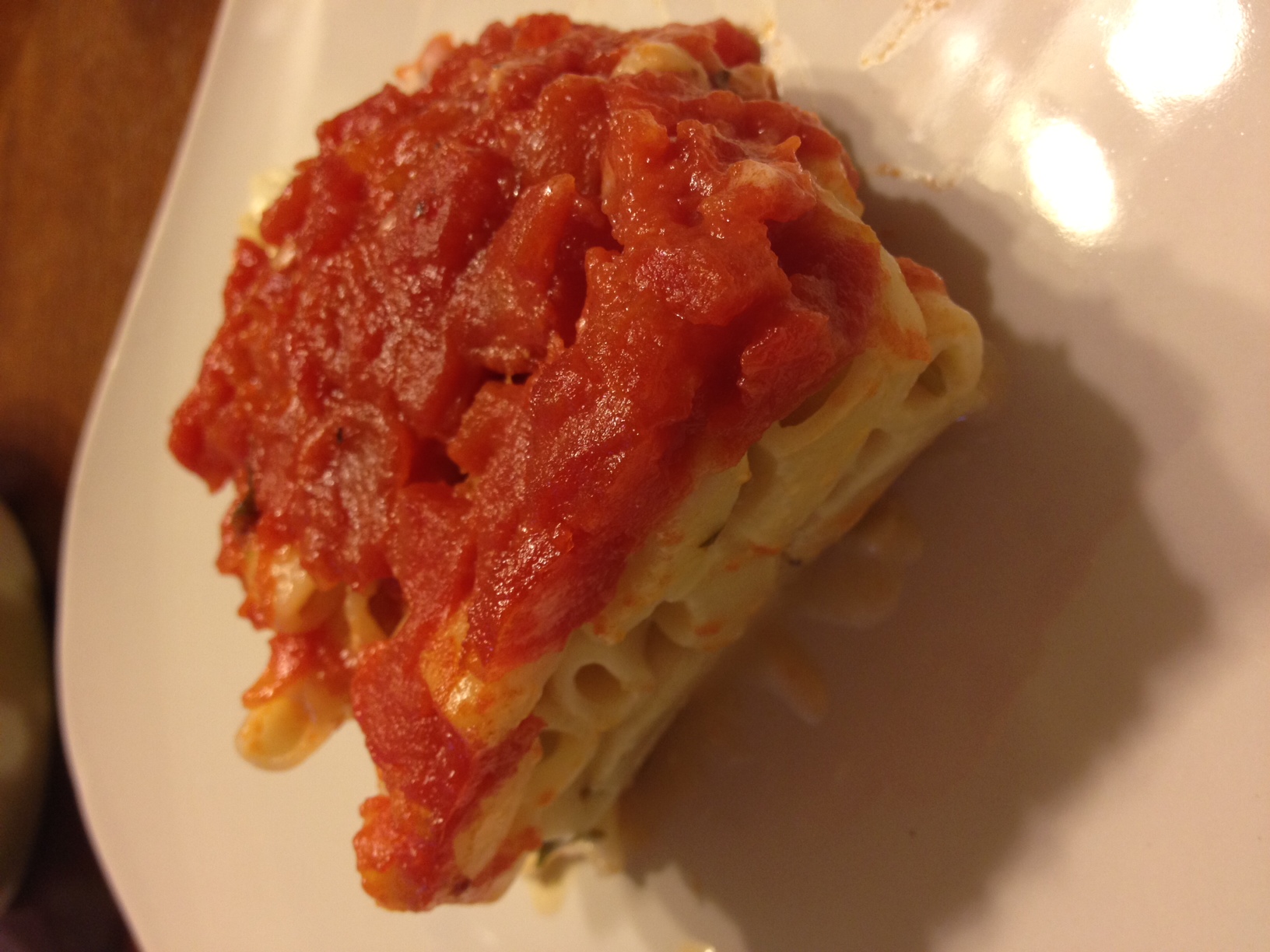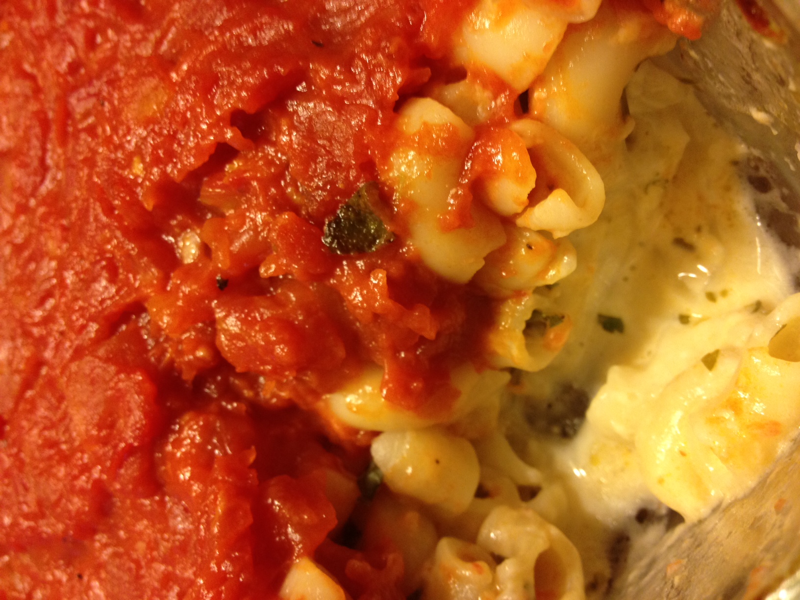 Grease an 8×8 glass pan. Pour pasta into the pan. Cover with marinara sauce. Bake at 350 for 20 minutes, or until bubbly on the sides. Allow to rest 10 minutes before serving.