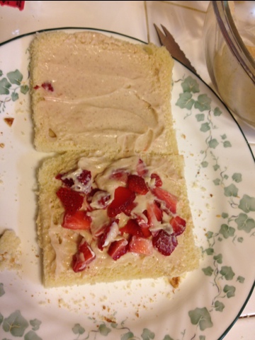 Using a good bread knife and good quality bread, remove the crust from the bread. Slice very close to the crust (it will fry more evenly). Smear one side of each price of bread with the stuffing goo. Place strawberries on 4 of the slices of smeared bread, keeping them at least 1/4″ away from the edges of the bread. Place the rest of the bread on top to make sandwiches. Lightly pinch the edges together to form a pocket.