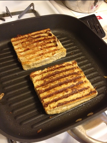 Dip the sandwiches in the batter, quickly, coating both sides. Place in a greased pan over medium heat. Allow to cook until you can see the edges start to brown.