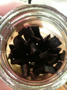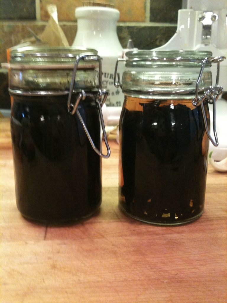 Pour in Jack Daniels to the top of the vanilla beans, place lid on jar and let rest at least three weeks before using. (Notice in the third picture, the color difference beween my jar on the left that’s been soaking a long time and the jar on the right, which I just assembled). As you use the extract, be sure to refill the jar to the top with more Jack Daniels so that it will have time to steep with the beans before your next use. The seed inside the bean is easy to use by squeezing the small end of the bean and moving your fingers down the bean. The seed will come out the end in kind of a black paste. Once you use the beans, flip the pods over, allowing whatever leftover seeds to run into the liquid and also letting you know the inside of the pod is spent. The empty pod will still impart flavor to your liquid, or maybe even a hot pan of milk destined to be cocoa, so don’t throw them away.