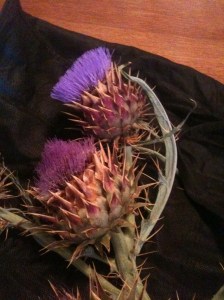 All along the rolling hills of northern California live the most amazing things-free artichokes! Okay, maybe not the kind you are used to seeing in the store but, despite their smaller size, the flavor is the same (better in my opinion, actually). And free, if you don’t mind the prickly, aggressive spines. My husband and I went picking a little late last year so we ended up with some very beautiful electric blue flowers but no food.