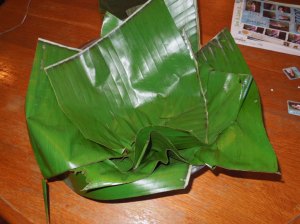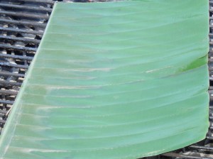 Banana leaves are and excellent cooking tool. However, without a little help, the tend to be rigid and difficult to wrap around a roast. There are a couple of methods to soften the leaves. Some people like to soak them in hot water. I don’t bother wasting the water. Instead, I throw them on the already hot grill. Here are some photos of the leaves. You can see that, as the stoften, they change to a darker green color and have a sheen. It only takes a few seconds per side so watch closely and have the grilling tongs on hand.