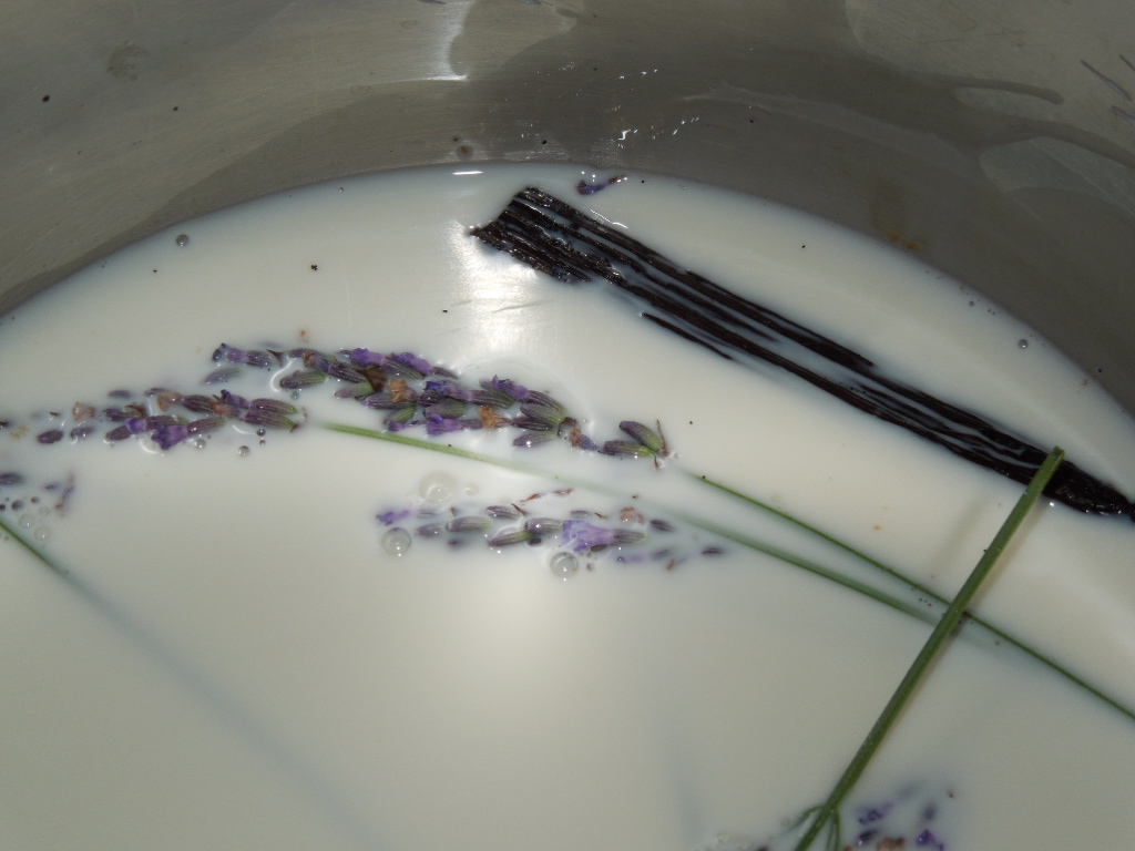 In a medium saucepan combine lavender sprigs, milk and vanilla bean. Turn on heat to medium low. Cook just until milk is hot. Take pan off of burner (turn burner off) and let mixture cool completely. Once cool, remove lavender and vanilla from milk and reserve for later use in batter. Take lavender sprigs out, remove flowers from stem and rough chop. Cut open vanilla bean lengthwise, scrape seeds from inside and reserve for incorporation into batter.