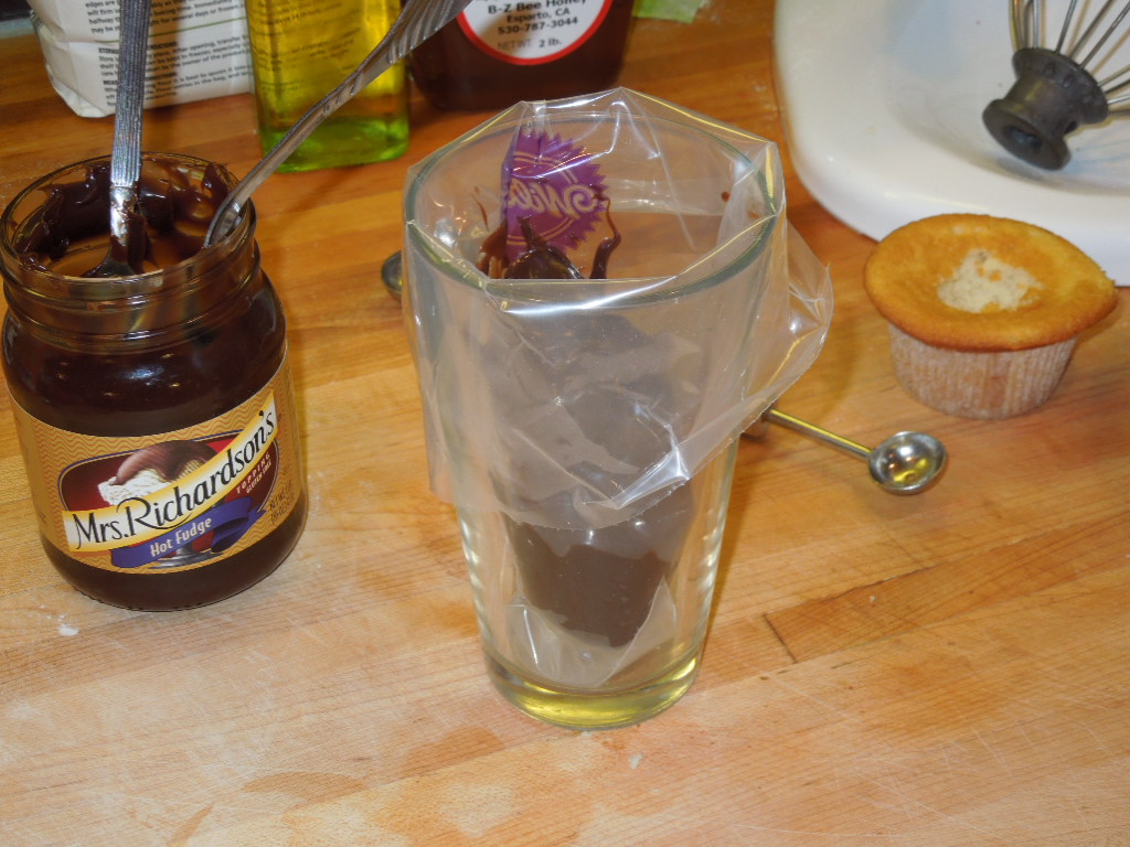 Using a tall glass to stabilize a piping bag or Ziploc bag, spoon hot fudge into the bag, smooth the hot fudge down toward the tip, cut the tip of the bag to desired hole size then twist the end and squeeze the bag to let any air out of the bag until hot fudge comes to the tip. Fill the cavities of each cupcake with the hot fudge then swirl hot fudge on the top.