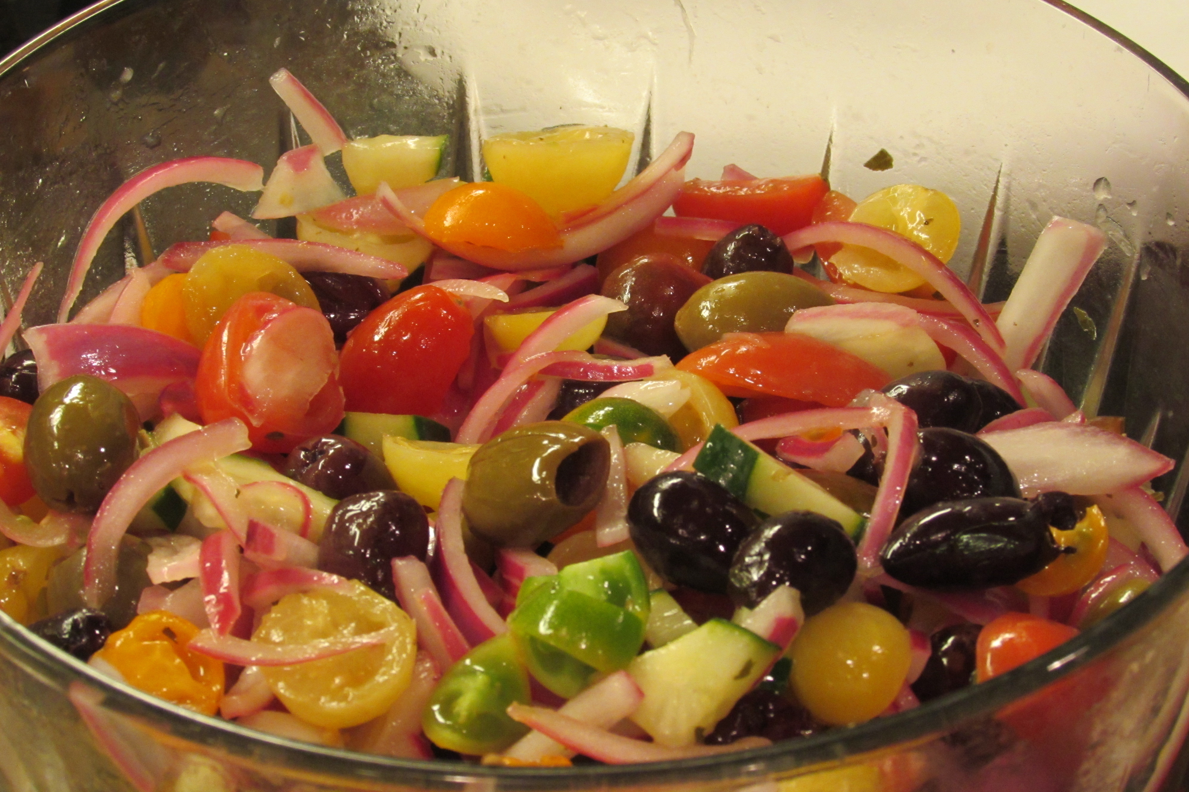 1 pound deli style (marinated, not pickled), pitted calamata and green Greek olives