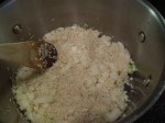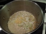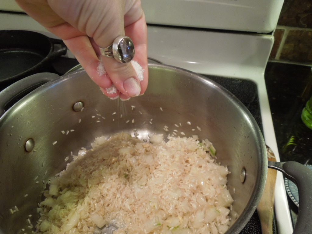 Preheat a medium sized sauce pan that has a well-fitting lid to medium heat. Melt 2 tablespoons of the butter (reserving the remaining two) and olive oil together in pan, then add the onion, garlic and rice and stir to coat. Sprinkle with salt and stir regularly to ensure even cooking.