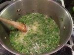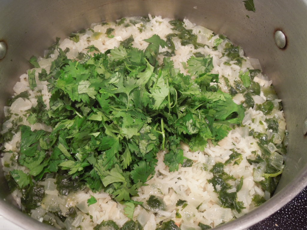 Once onions are translucent and rice is starting to brown (around 5 minutes), stir in water and half of the cilantro (reserving the second half to finish).