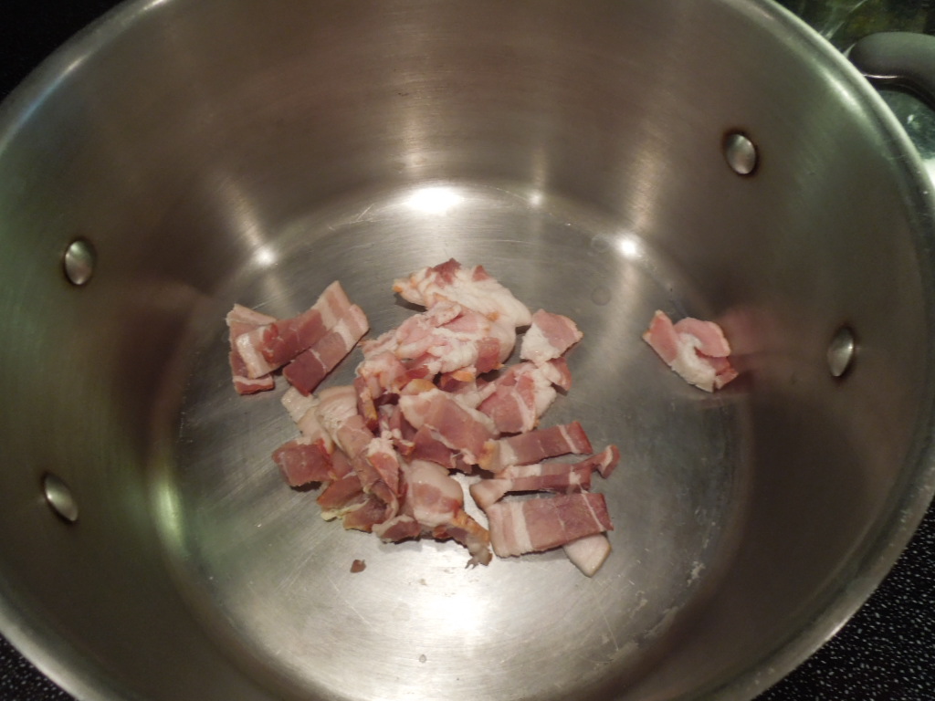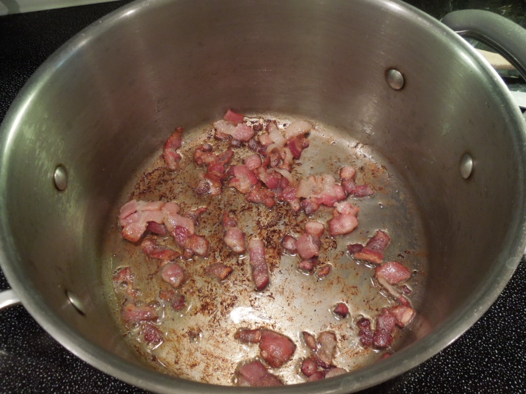 Place bacon pieces into a stock pot on medium low heat. Render the fat out of the bacon by cooking it on medium low for around 8 minutes.