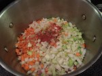 Bring temperature up to medium heat. Add in the diced broccoli stalks, onion, carrot, celery, potato, garlic, salt, pepper and paprika. Cook, stirring occasionally, until the vegetables are tender. Add in flour, and continue cooking, stirring constantly, for 2-3 minutes.