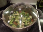 Pour water in pan and stir mixture together. Add cut broccoli crowns on top of vegetable and water mixture (do not stir), place lid on pot and allow broccoli to steam around 4 minutes.