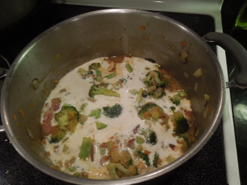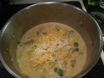 Remove lid, stir broccoli into water and vegetable mixture. Allow mixture to just start to simmer, then stir in heavy cream. Once the soup starts to thicken, stir in the cheese, a little at a time, making sure each addition is fully melted before adding more cheese.