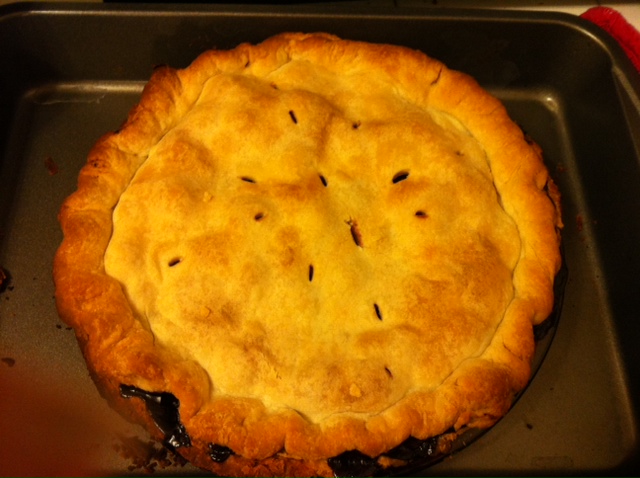 Bake crust in oven for 15 minutes, remove from oven, remove beans (which can be saved and reused for this same purpose) and tin foil. Let crust rest 5 minutes. Meanwhile, roll out the top crust to desired thickness. Fill bottom crust of pie (today I made blackberry pie), top with top crust, trim top crust and edges by crimping with your fingers around the edges. The top crust should be folded under into the bottom crust. Using a sharp knife, cut vent holes in top crust and return pie to the oven. Bake 40 minutes to one hour (depending on filling) or until the filling starts bubbling out of the vent holes in the top of the pie. Do you like a little shine on your pie crust? Brush the pie crust before, during and after baking with a little milk. Let pies rest at least 15 minutes before serving so that filling has time to set up and crust has time to rest.