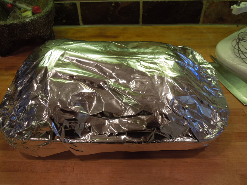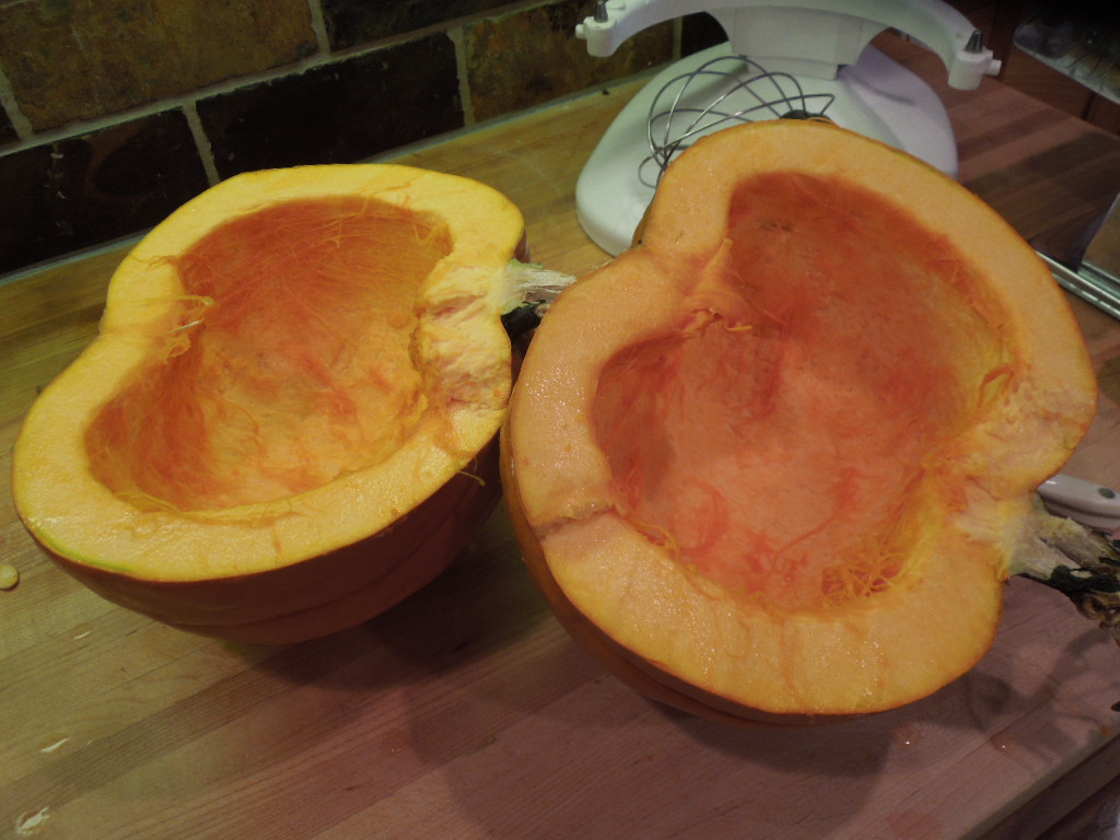 Preheat oven to 400 degrees. Cut pumpkin in half lengthwise, scoop out insides (reserving pumpkin seeds for either roasting or growing later – see below). Place pumpkin halves face down in a large pyrex dish. I had to trim these a little to get them to fit in the pan. Pour enough water into the bottom of the pan just to cover it. Cover entire pan in aluminum foil and place in oven. Cook for 1 hour or until a sharp knife easily penetrates the foil and pumpkin. Remove pan from oven and allow to cool completely.