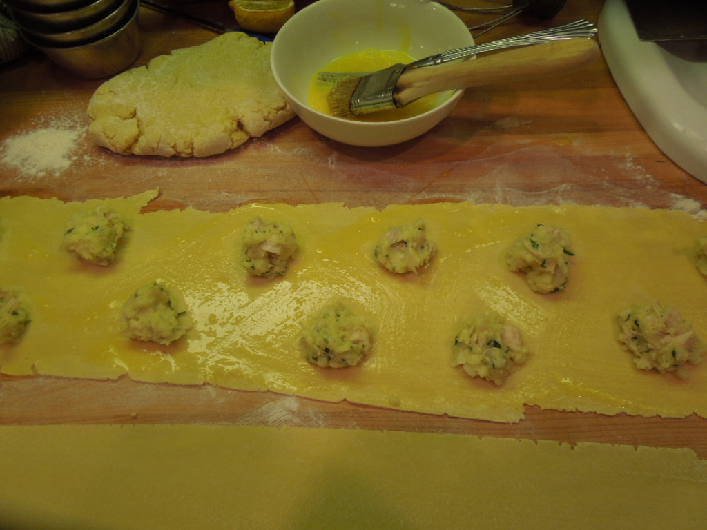 In a small skillet, over medium heat, combine olive oil, onion, garlic and salt. Cook until just translucent. Remove from heat, let cool a couple of minutes, then mix (do not strain off oil) together with mashed potatoes, parsley, basil, rosemary, cheeses and egg. Once well-combined, stir in turkey breast. Set aside and prepare pasta dough.
