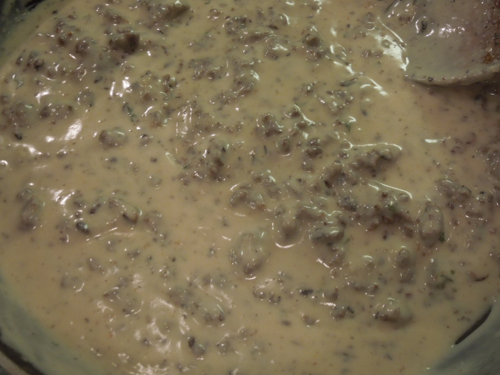 Sautee until meat browns (Note: If you are going with the vegetarian option, the mushrooms will release some moisture. Wait until that moisture mostly cooks off then…). Sprinkle in flour and stir to coat thoroughly. Stir occasionally until the flour starts to turn golden. Once golden, stir in ½ cup water and let the mixture come to a simmer. Stir in whipping cream, thyme, parsley, sage and milk. Let mixture cook, stirring frequently, until it thickens, stir in butter until melted and mixed in thoroughly. Serve over fresh biscuits, rice or pasta.