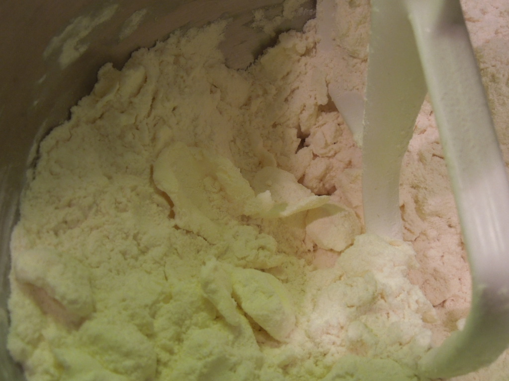Combine flour and salt together, then cut in ¾ cup (12 tablespoons) butter until incorporated, but pieces of butter remain. Check this out – here is a photo of how it should look – notice the little flat looking “wafers” of butter? Stop mixing!