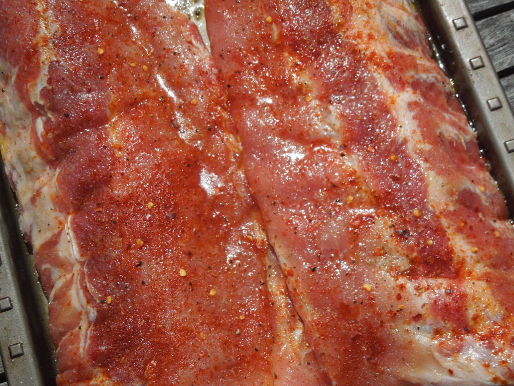 On the meat side of the ribs only, rub olive oil then sprinkle with kosher salt, garlic powder, cayenne pepper, black pepper and crushed red chili flake. Place ribs on the grill, bone side down.