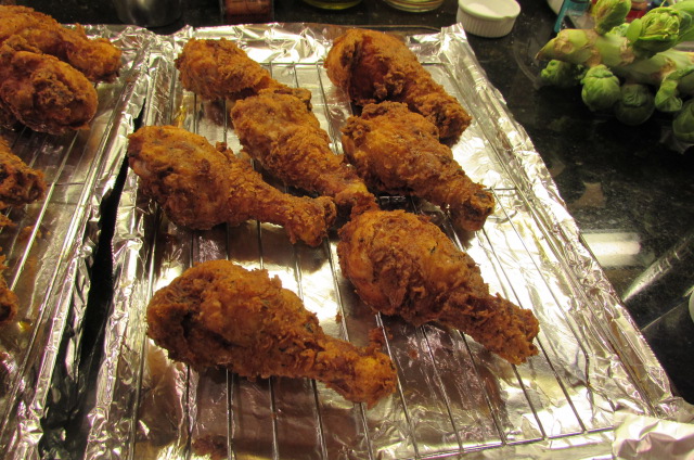 In a large skillet (I usually use cast iron) heat peanut oil to medium heat. Once oil reaches 350-360 degrees, dredge buttermilk soaked chicken pieces in the dry mixture. Tap off excess flour, and fry 3-4 pieces at a time, being sure not to crowd chicken pieces in the pan. Cook for 3-4 minutes per side (4 minutes for larger pieces). Remove pieces from oil, allowing excess oil to drain off, then transfer chicken on prepared cookie sheet rack. Once all chicken is fried, let rest on cookie sheets 10-15 or as long as two hours. (Go ahead and clean up the grease, air out the house and go shower before your guests arrive, right?)