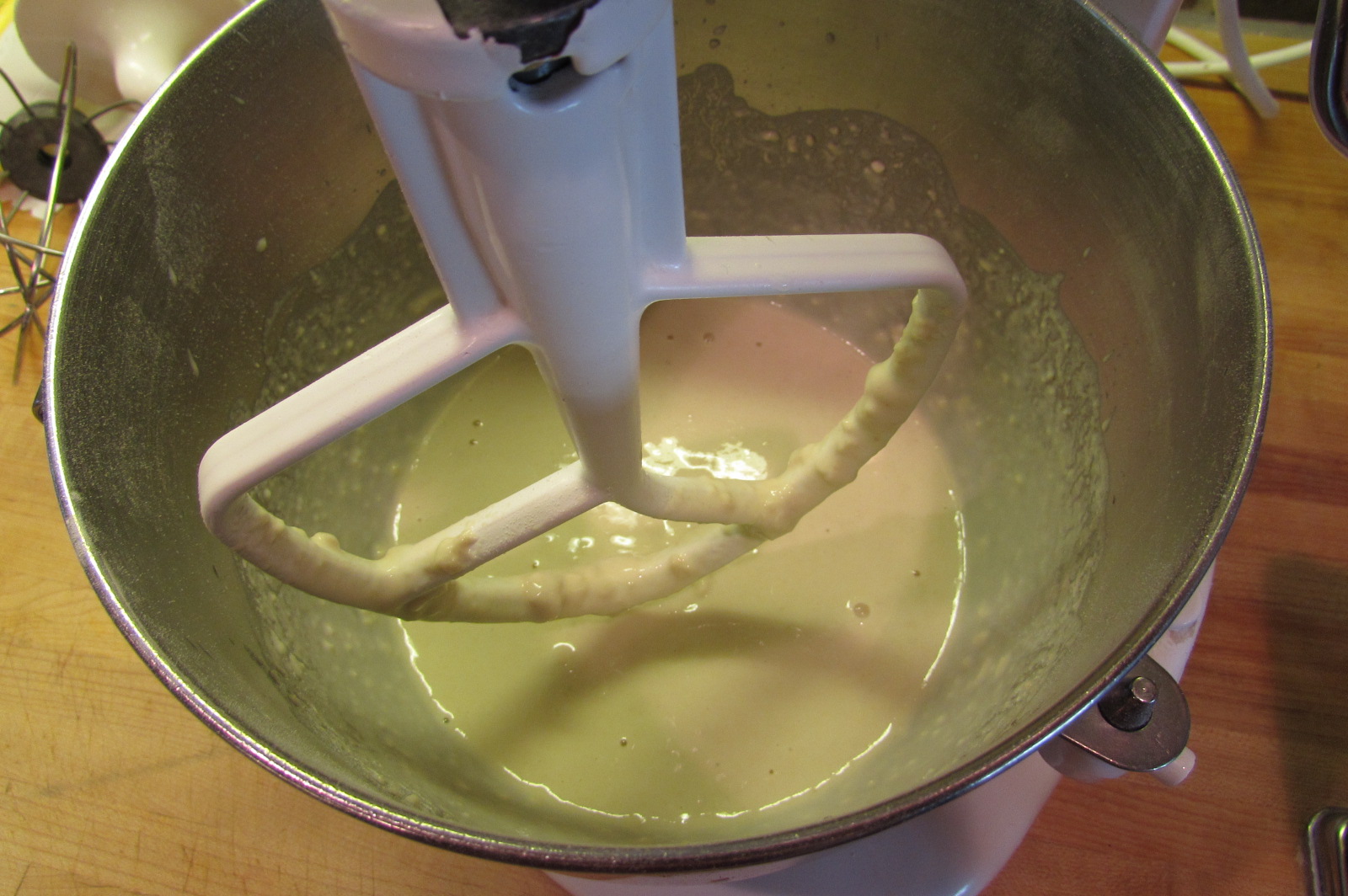 Using a paddle attachment on stand mixer at low speed, combine gluten flour, salt, yeast, water and 1 ¼ cup (6.5 ounces) flour until thoroughly combined (2-3 minutes). Mixture will look lumpy. Let mixture rest about 10 minutes.