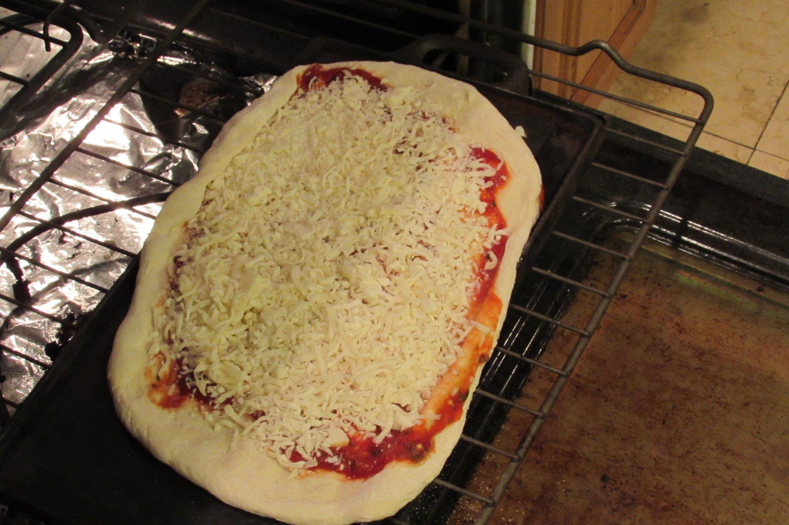 Preheat oven to 425 degrees with a pizza stone or a baking sheet on the lowest rack in the oven. (I use a cast iron griddle.)