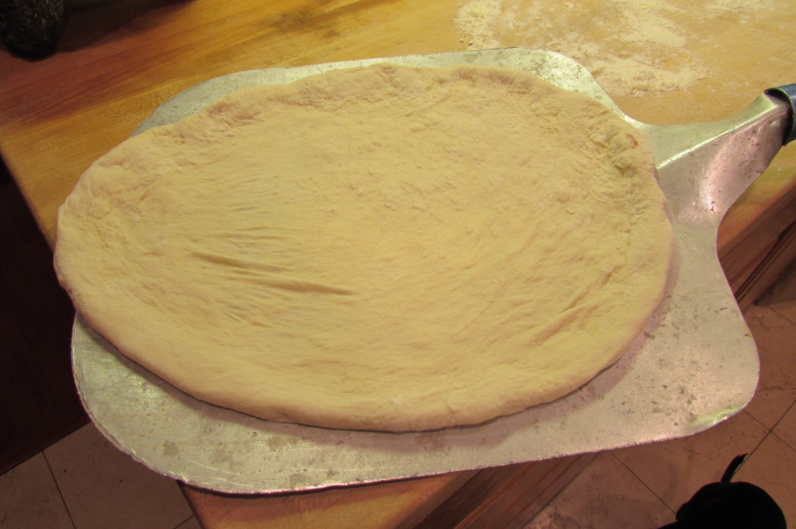Using your hands, stretch dough until very thin – almost see-through in the middle. Sprinkle a pizza peel (I inherited this awesome peel from Great Uncle Earl) or pizza pan with a little corn meal. The corn meal will act as ball bearings between the pizza peel and dough when you slide your pizza onto your pizza stone or hot pan. Place pizza on peel or pan with no sides, top with sauce, cheese and desired toppings. Carefully slide pizza onto pizza stone or pan. Cook for 12-15 minutes (longer if using more toppings).