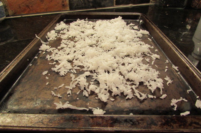 Preheat oven to 400 degrees. Spread shredded coconut evenly on a baking sheet. Bake in oven, stirring every 3 minutes, until coconut is evenly browned. Remove from oven and let cool completely.