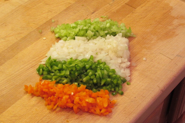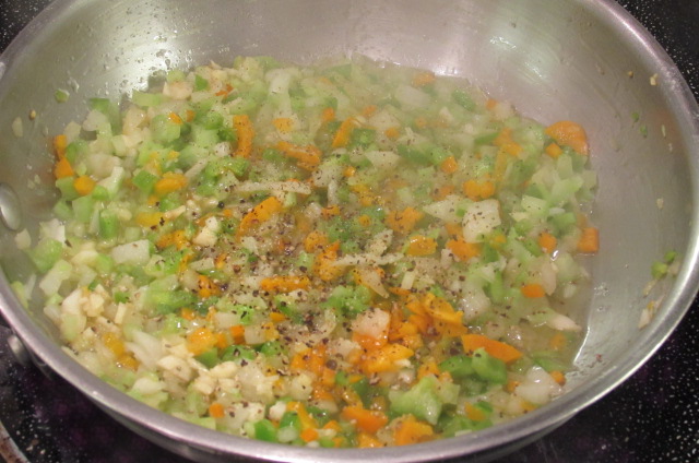 Preheat oven to 400 degrees. Heat a sautee pan to medium heat and melt oil and butter together in pan. Add green onion, green pepper, red pepper, celery and garlic in the pan. Sprinkle with a pinch each of salt and pepper and toss to coat. Let mixture cook for 2-3 minutes or until onions are translucent. Remove from heat and transfer mixture into a fine mesh strainer over a bowl to drain of any excess liquid.