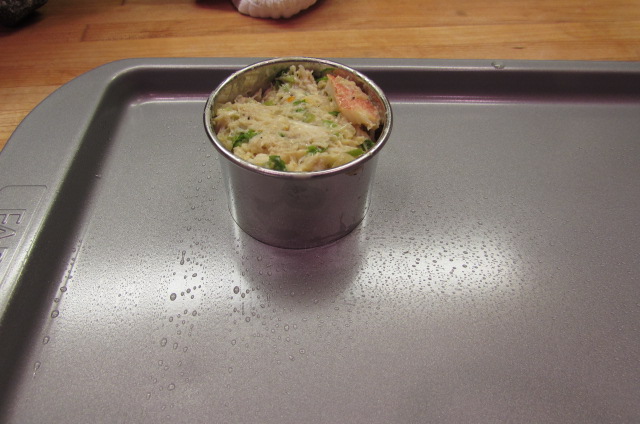 Spray a sheet pan with cooking spray. Spoon crab cake mixture into a tall ring mold and pack down with the back of a rubber scraper. Carefully remove the ring mold and repeat until all of the mixture is used up. Bake crab cakes in oven for 10-15 minutes or until the cakes are golden on the edges and hold firm under gentle pressure. Remove from oven and let cool. Remove any liquidy looking edges with a butter knife or spatula.