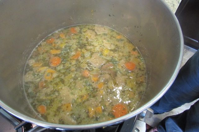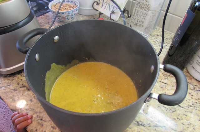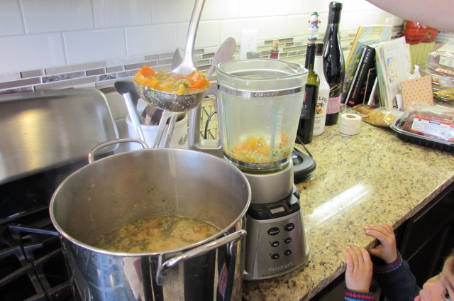 Working in very small batches, transfer soup by ladle full to a blender or food processor. Warning-fill blender no more than 1/4 full at a time. The mixture is hot and will expand and make a huge mess and possibly burn you, if you fill your blender. After each batch is fully pureed, pour into a second pot. After everything has been pureed, stir together one final time.