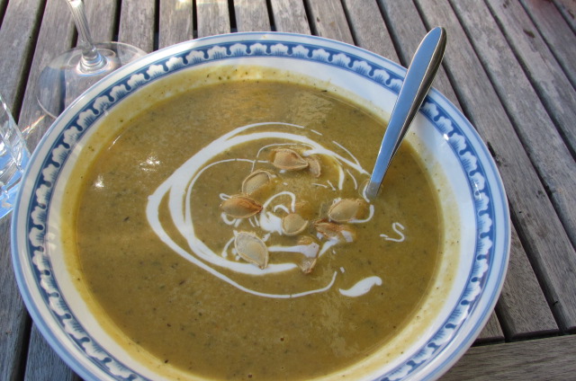 Either keep warm on low heat or plate, garnish and serve right away. Today we are using some beautiful creme fraiche and toasted, salted pumpkin seeds. Delish!