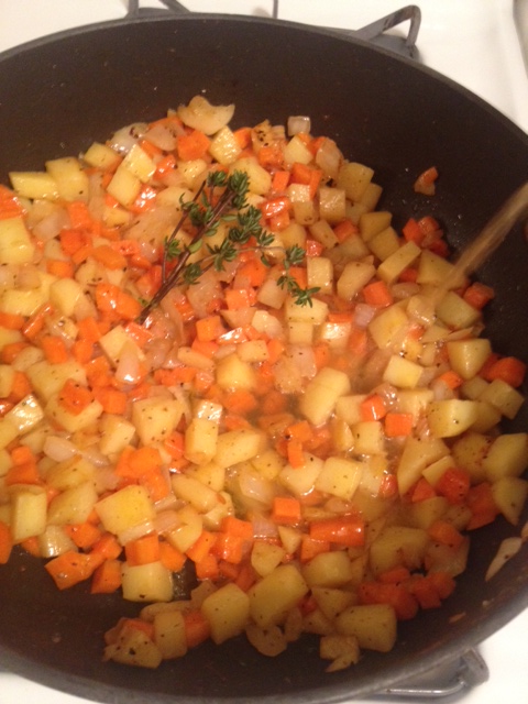Pour the warmed stock over the vegetables, using enough to completely cover all the vegetables. Add in thyme. Stir occasionally for about 10 minutes, or until the potatoes begin to soften, but are not completely soft.