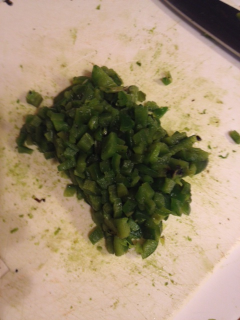 After charring your jalapenos, you’ll want to immediately put them into a bowl covered tightly with plastic wrap. Allow them to cool, then remove the charred skin from the outside, then remove the seeds and ribs from the inside, using the flat side of a steak knife. Dice your jalapenos into small pieces and set them aside.