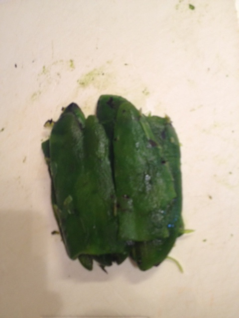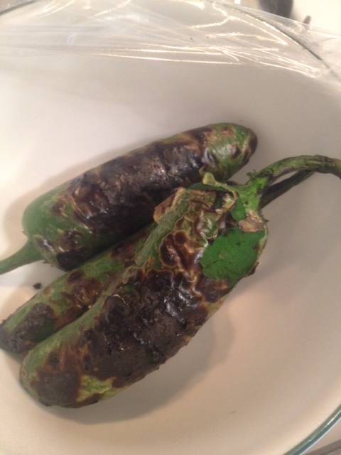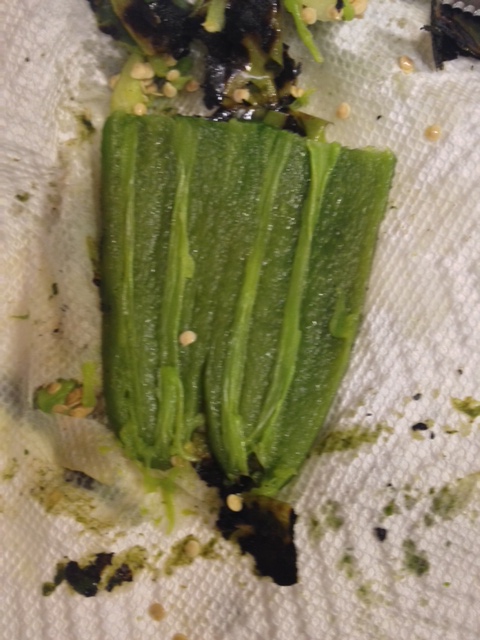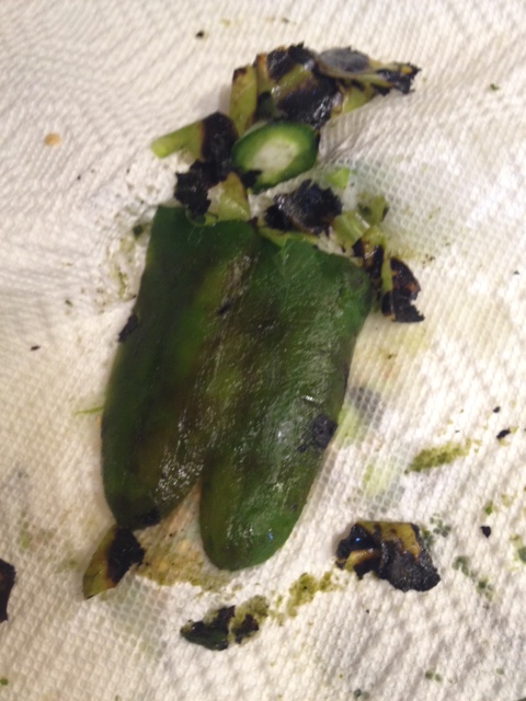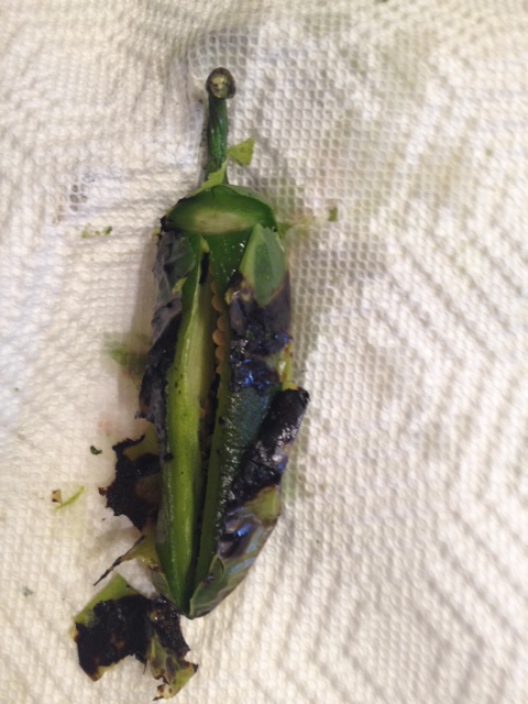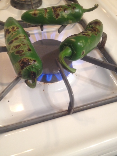 To make these, first you’ll need some fresh jalapenos. You’ll want to roast them. You can do this on a pan in your hot oven or hot stove, rotating the jalapenos until they are charred all around. Or if you have a gas stove, put the jalapenos right on top of your stove grates and roast away! I used 3 jalapenos, which gave the dip a mild-medium spice. By roasting your jalapenos, you are removing much of the spicy heat from them.
