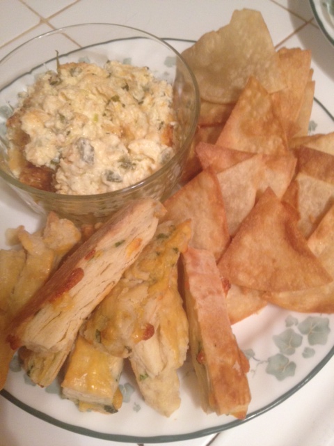 I had a hankering for jalapeno cheese dip, so I made this up on the fly. It was SOOOOO good! Trish was kind enough to stop by with some of her Cheddar Green Onion Biscuits, cut into strips that were perfect for dipping. I fried up some fresh tortilla chips too, and this dip was gobbled up by Superbowl party patrons in record time.
