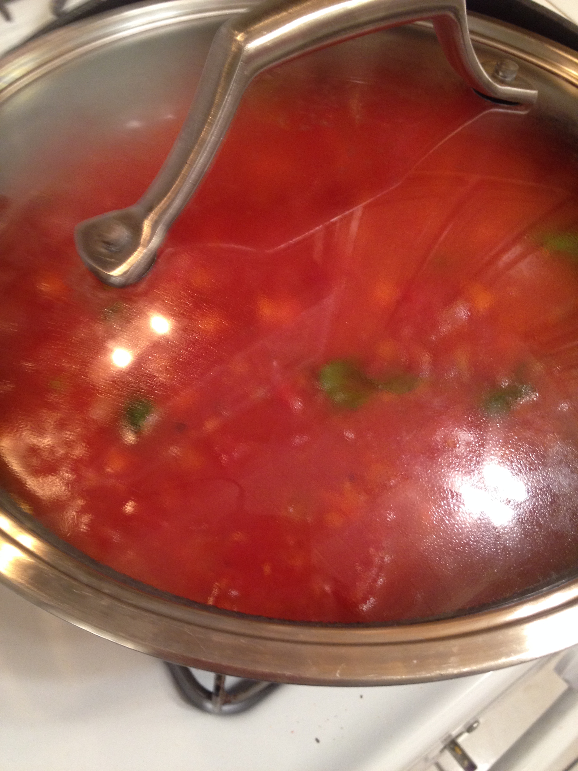 Cook uncovered over medium-high heat until it begins to bubble. Cover with a tight fitting lid and reduce heat to medium low, stirring occasionally for 20 minutes. Remove lid and reduce heat to low, cook an additional 20 minutes on low. Remove thyme sprig. [Stop here for Chunky tomato soup.]