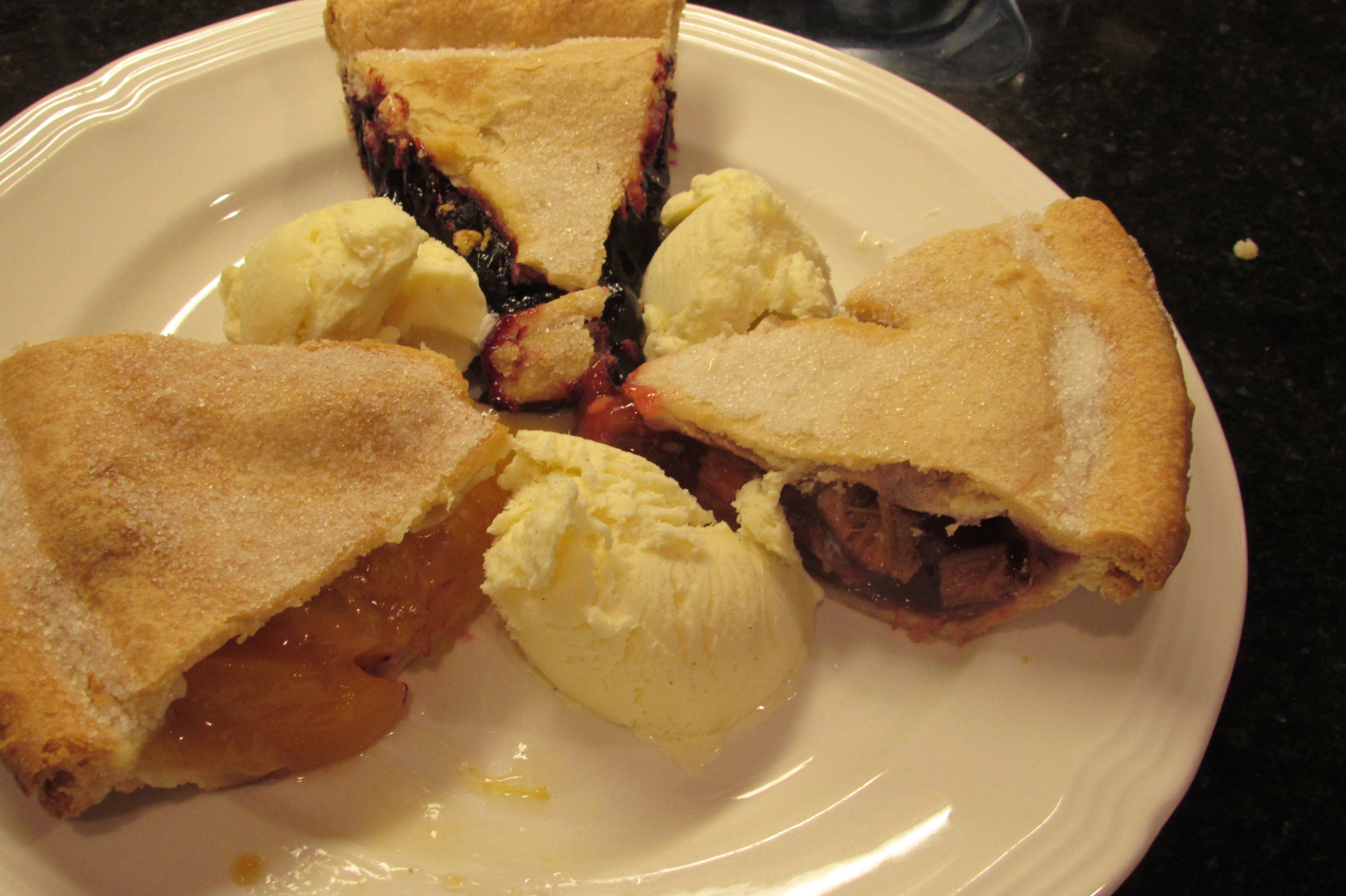 UM, so what, no pie? What? Of course there was pie! For the Halloween bash we had two kinds of lasagna pie – one from me and one from Amelia. Both were devoured instantly. On my actual birthday, however, my husband picked me up some pie from two of my favorite places – first of all, we had pizza pie from Napoli Pizza in Vallejo. We here at CPM recommend the Tony’s Special calzone. It isn’t on the menu but they will make you one. Awesome, as always! Secondly, we had 3 kinds of fruit pie from the Buttercream Bakery in Napa, CA. I had to serve it with some of my homemade ice cream (a blog for a different day).