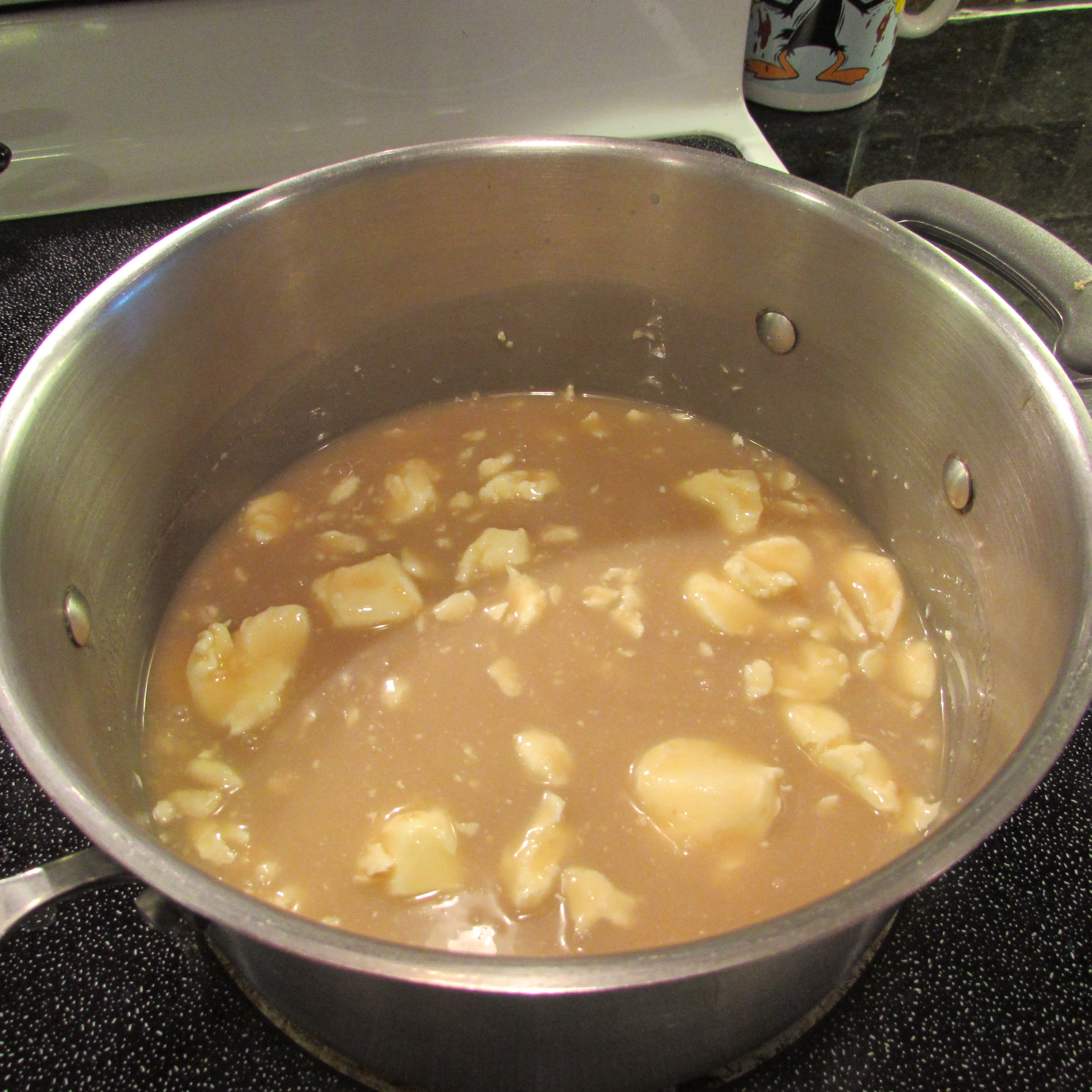 Using the reserved butter wrapper, butter a 9”x13” Pyrex or other heat resistant glass pan. In a large sauce pan, combine all ingredients except for vanilla. Cook over medium heat, stirring frequently until mixture starts to boil. Clip a candy thermometer to side of the pot, and continue cooking and stirring until the gauge reads 246 degrees F. Remove pot from heat, stir in vanilla and pour caramel into prepared pan. Once caramel is fully cooled and set (around 3 hours), using a metal spatula or butter knife, remove slab of caramel from pan and cut with a knife or bench scraper into desired shapes. Wrap in candy wrappers, waxed paper or plastic wrap.