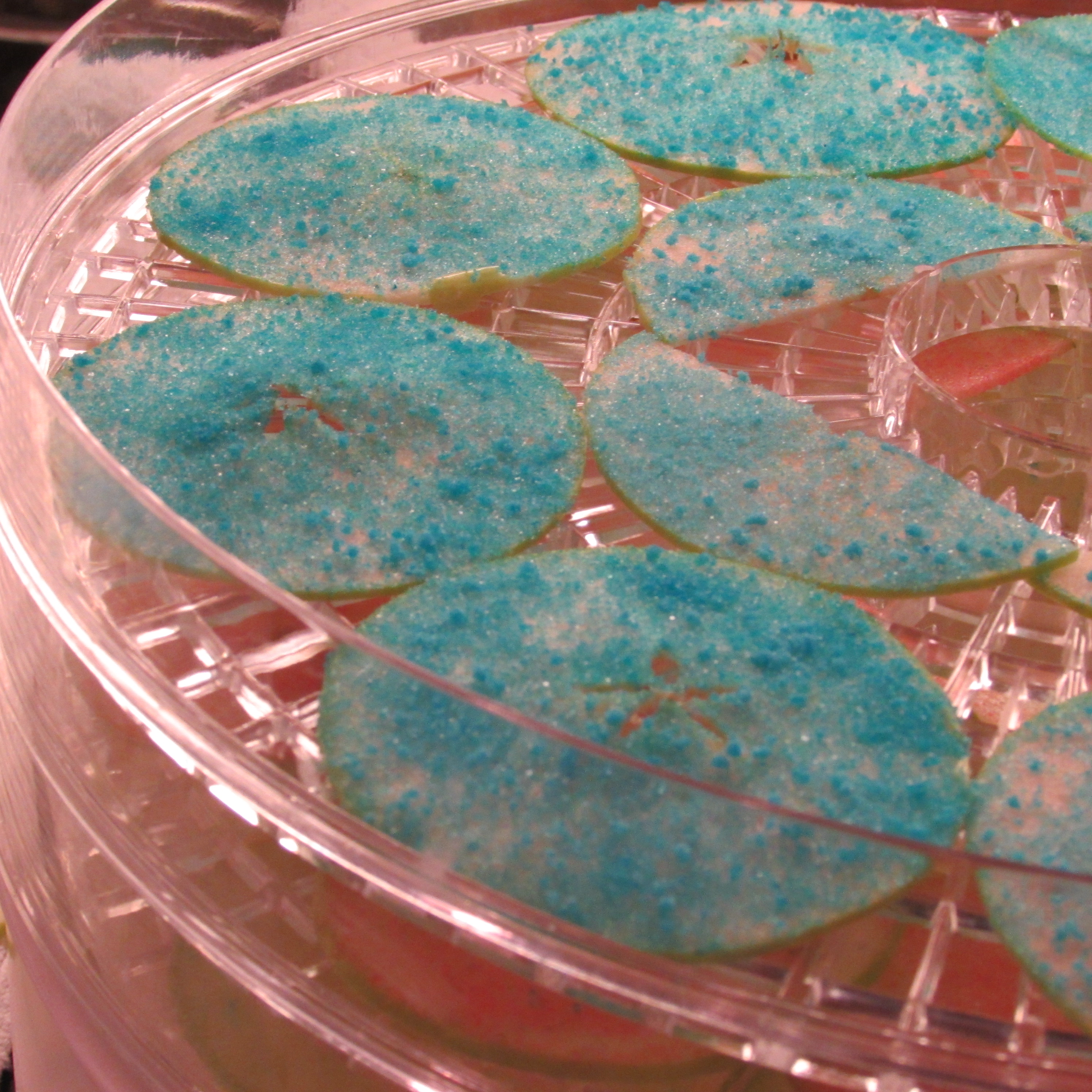For about a year, when I was very young and Amelia was just barely a baby, we lived in an old farmhouse in the Bellingham/Demming area of Washington State. Our family was good friends with an older couple, Myrt and Jens Jensen, who lived just down the Sand Road from us. Myrt was famous locally for all of her delicious goodies. She made everything from preserves to molasses cookies. She even taught Amelia her first words. One of my favorite treats was Myrt’s dried apples. Making them even sweeter, before putting the apples in her food dehydrator, she would coat the tops in dry Jell-o powder, which made a delicious candy-like glaze. This past week, I had some nice Granny Smith apples and, having stumbled upon this awesome Jolly Rancher gelatin, I had to give a blogger’s shout out to old Myrt. While she may have passed on years ago she and her recipes still live on in our memories.