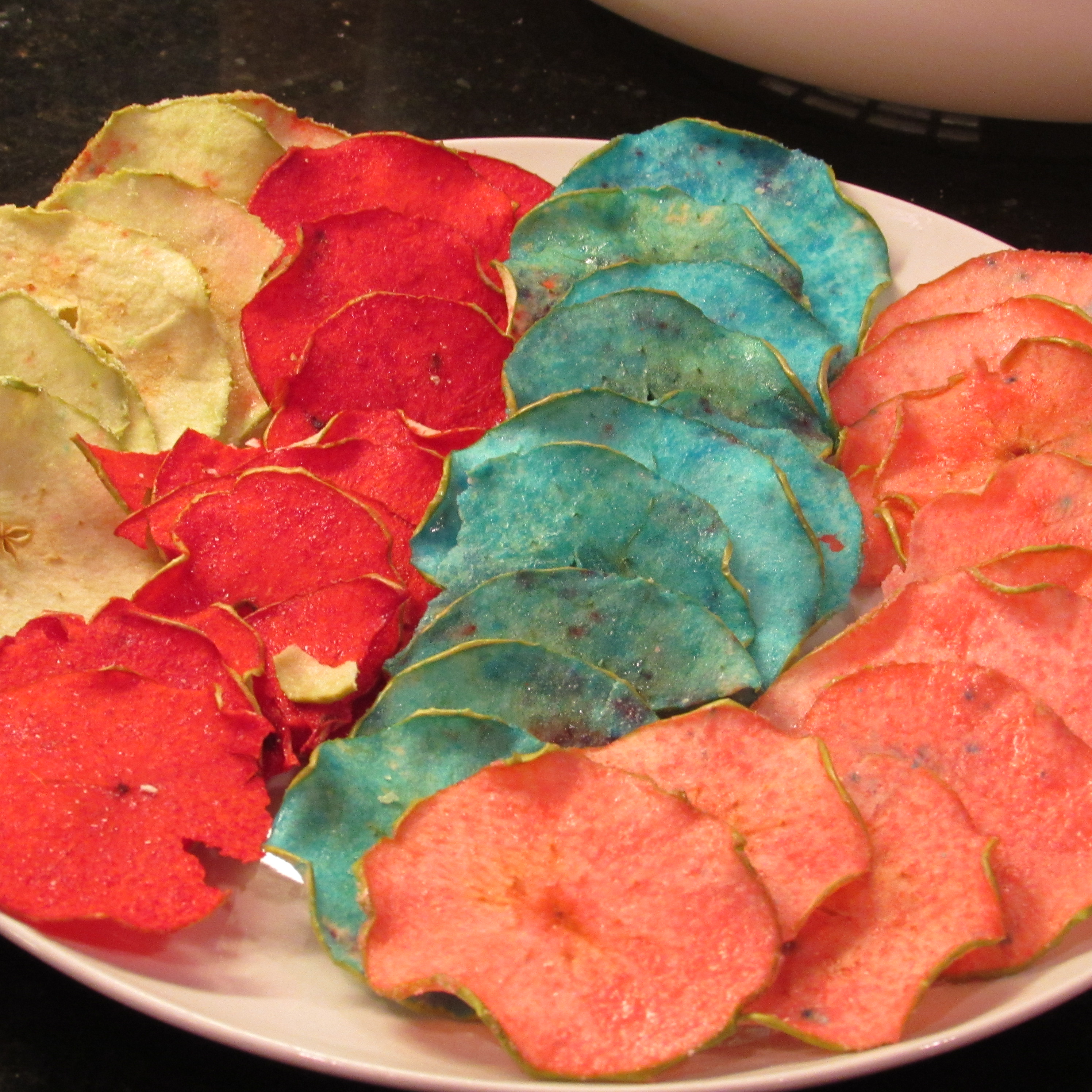 Stir lemon juice into a bowl of cold water. Once apples are sliced, rinse them and put them in the lemon water. Soak around ½ hour to keep apples from browning. Layer slices of apple between towels to dry. Once dry, coat one side of the apple slices in the Jell-o powder. Place slices, uncoated side down, on dehydrator racks. Dehydrate chips until desired texture is achieved and Jell-o powder is melted – usually 8-10 hours. Note: The thinner the slice and longer dehydration time will produce a crispier chip while a thicker slice and less drying time will result in a softer chip. Remove apple chips from dehydrator and store in an airtight container.