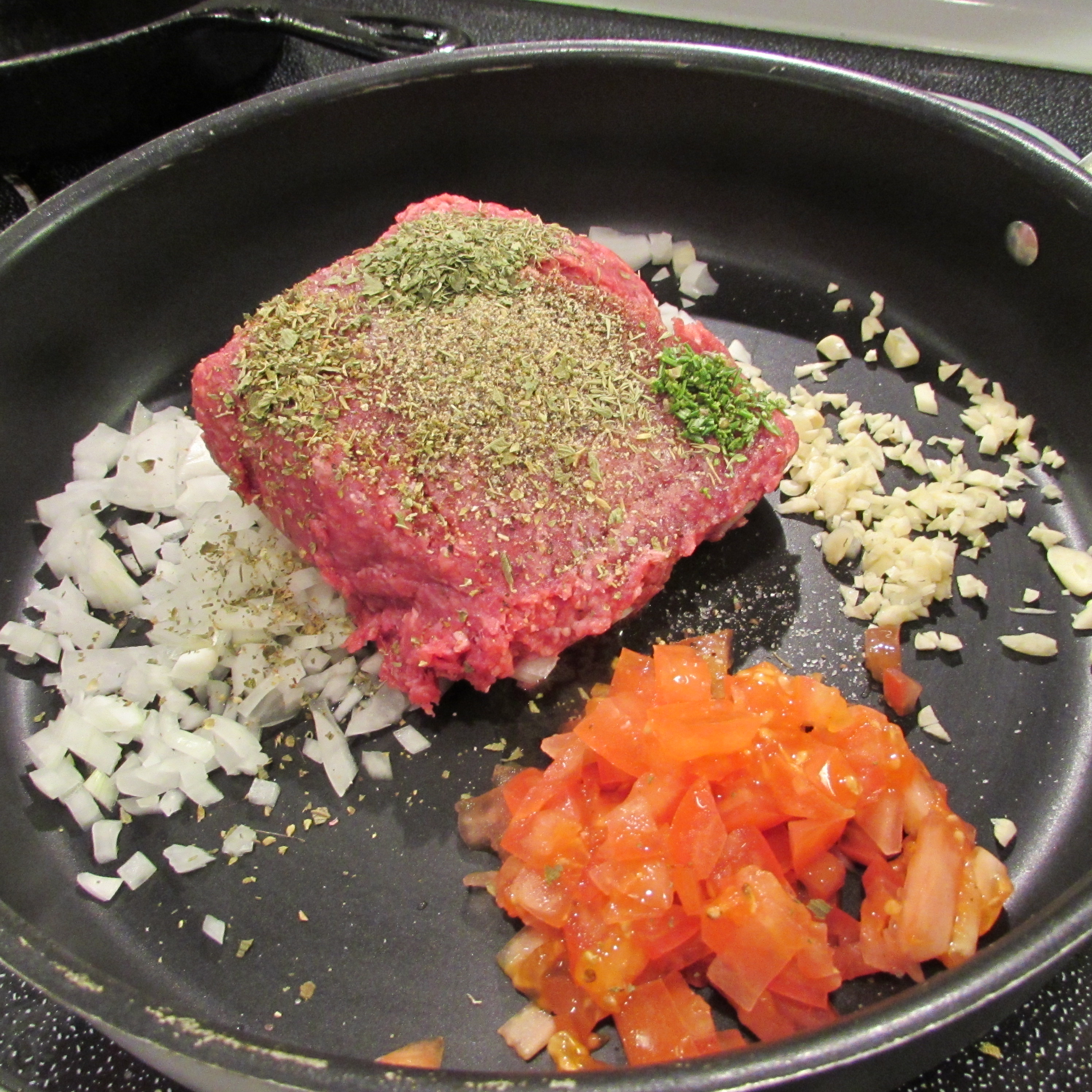 Preheat oven to 375 degrees. In a pan over medium heat, combine bison, onion, tomato, garlic, salt, pepper, oregano, basil, parsley, thyme and rosemary. Cook, stirring occasionally, until meat is browned. Add in tomato sauce and bring just to a simmer. Continue simmering, stirring occasionally for around 5 minutes. Remove from heat.